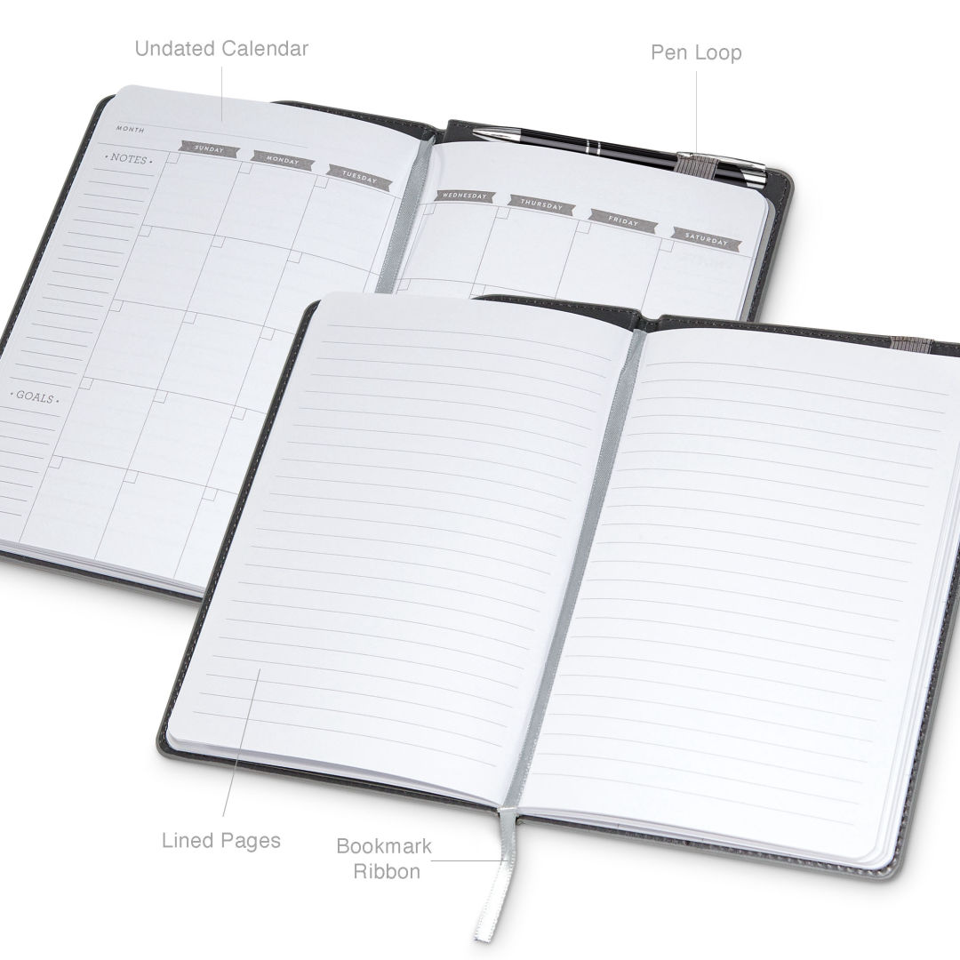 A modern twist on the classic thinker’s journal. A reliable travel companion, sure to inspire writings, thoughts and plans for the future.The Soca Journal Features…- Unique two-tone design with pen holder on the top- Stiched Leatherette cover- 192 white, lined pages- Acid-free 80 gram paper- Lay-flat binding- Bookmark ribbon- Top pen port- Cool gray endpages, *Belly Band & Promo Page Inserts Optional. See Decorating Info for details. 5.75″ W x 8.625″ H